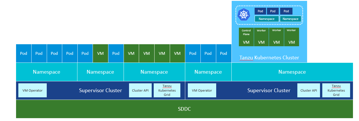 vSphere with Tanzu 解决方案的基础是由 vSphere 7+、NSX-T 和 Storage 组成的 VMware SDDC 堆栈。该解决方案将 vSphere 集群转换为工作负载平台,每个 vSphere 集群都具有 Kubernetes 控制平面,称为主管集群 Supervisor Cluster。